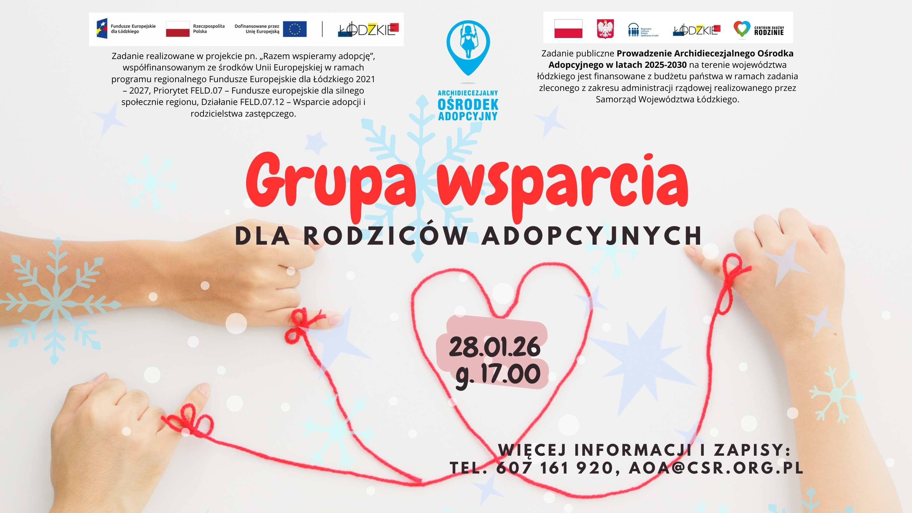 => Od maja 2025 roku "Grupę wsparcia dla rodziców adopcyjnych" realizujemy, jako zadanie w ramach Projektu pn. "Razem wspieramy adopcję" współfinansowanego ze środków Unii Europejskiej w ramach programu regionalnego Fundusze Europejskie dla Łódzkiego 2021 – 2027, Priorytet FELD.07 – Fundusze europejskie dla silnego społecznie regionu, Działanie FELD.07.12 – Wsparcie adopcji i rodzicielstwa zastępczego.