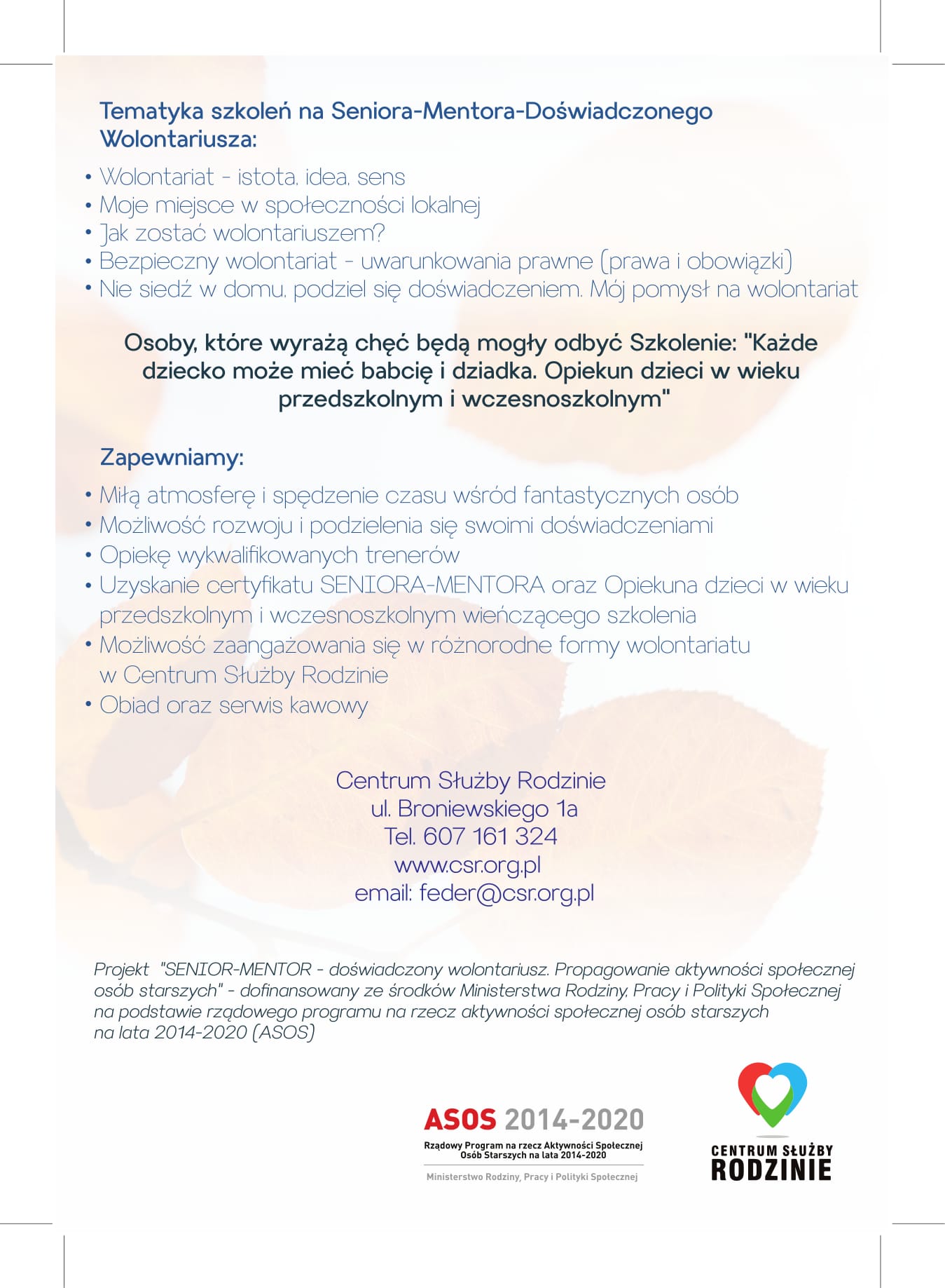 Serdecznie zapraszamy na bezpłatne szkolenia na wolontariuszy oraz wolontariuszy opiekunów dzieci w wieku przedszkolnym i wczesnoszkolnym. Szkolenia odbywają się w Centrum Służby Rodzinie, przy ul. Broniewskiego 1a.