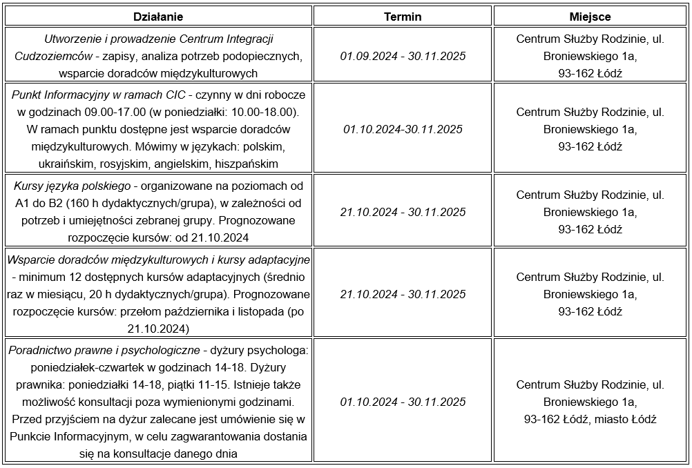 W ramach projektu "Centrum Integracji Cudzoziemców przy Centrum Służby Rodzinie", dofinansowanego z Europejskiego Funduszu Społecznego Plus, w Centrum Służby Rodzinie w Łodzi (przy ulicy Broniewskiego 1a) powstaje Centrum Integracji Cudzoziemców dla obywateli państw trzecich, którzy nie posiadają obywatelstwa żadnego z krajów UE ani krajów takich jak: Norwegia, Islandia, Liechtenstein, Szwajcaria. W ramach CIC świadczone będzie wsparcie w zakresie integracji społeczno-gospodarczej dla legalnie przebywających w Polsce cudzoziemców z grupy docelowej.