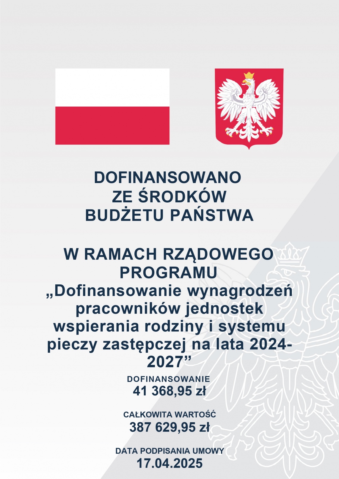 Kwota przyznanego dofinansowania zadania publicznego Prowadzenie placówki wsparcia dziennego w formie opiekuńczej, funkcjonującej poza obszarem rewitalizacji (Świetlica Środowiskowa „M. Łodzi Niegniewni”, ul. Broniewskiego 1a): 32 652,00 zł ze środków Budżetu Miasta Łodzi oraz 21 562,22 zł ze środków Budżetu Państwa (w ramach Rządowego Programu „Dofinansowanie wynagrodzeń pracowników jednostek wspierania rodziny i systemu pieczy zastępczej na lata 2024-2027”)